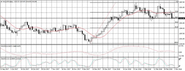 يتداول الذهب عند مستوى 1316.00$ للأونصة , حيث ارتد السعر نحو الاتجاه الهابط مستهدفا مستوى الدعم بالتزامن مع وجود خط الفيبو 38 كما هو موضح بالرسم , وذلك