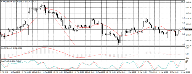 ويتداول الذهب الآن أعلى خط مؤشر متوسط الحركة ,  ويظهر كل من مؤشر استوكاستك ومؤشر ماكد تقاطع ايجابي نحو الاتجاه الصاعد على الاطار الزمنى اربع ساعات