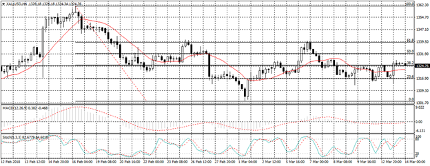 ارتد الذهب نحو الاتجاه الصاعد بعد ان فشل فى اختراق مستوى الدعم عند خط الفيبو 23 ليعيد اختبار خط الفيبو 38 عند السعر 1324.00$ للاوقية كما هو موضح بالرسم.