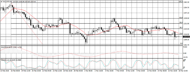 ويتداول الذهب الآن أسفل خط مؤشر متوسط الحركة , ويظهر كل من مؤشر استوكاستك ومؤشر ماكد تقاطع سلبي نحو الاتجاه الهابط على الاطار الزمنى اربع ساعات