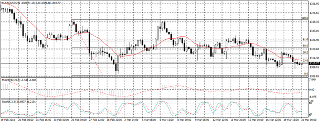 ويتداول الذهب الآن أسفل خط مؤشر متوسط الحركة , ويظهر كل من مؤشر استوكاستك ومؤشر ماكد تقاطع سلبي نحو الاتجاه الهابط على الاطار الزمنى اربع ساعات