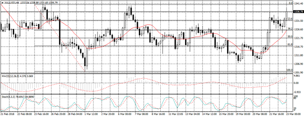 ويتداول الذهب الآن أعلى خط مؤشر متوسط الحركة , ويظهر كل من مؤشر استوكاستك ومؤشر ماكد تقاطع ايجابي نحو الاتجاه الصاعد على الاطار الزمنى اربع ساعات