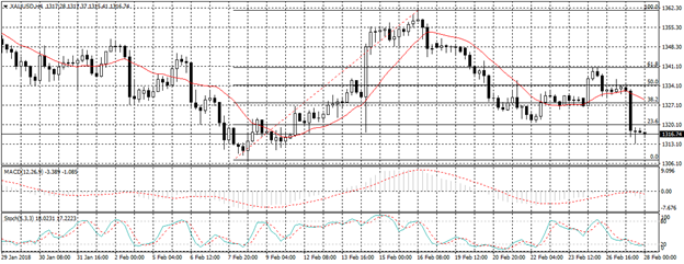 ويتداول الذهب الآن أسفل خط مؤشر متوسط الحركة ,  ويظهر كل من مؤشر استوكاستك ومؤشر ماكد تقاطع سلبي نحو الاتجاه الهابط على الاطار الزمنى اربع ساعات