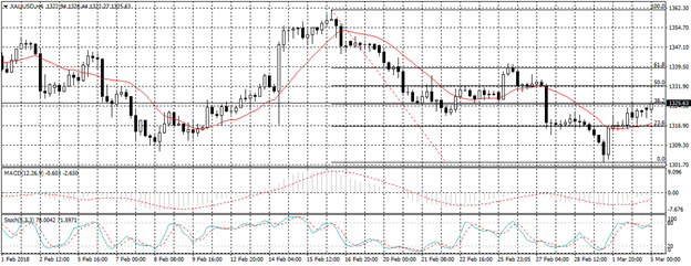 ارتد الذهب نحو الاتجاه الصاعد بعد ان نجح فى اختراق خط الفيبو 23 ليستهدف خط الفيبو 38 عند السعر 1326.00$ للاوقية كما هو موضح بالرسم.