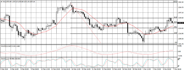 ويتداول الذهب الآن أعلى خط مؤشر متوسط الحركة , بينما يظهر كل من مؤشر استوكاستك ومؤشر ماكد تقاطع سلبي نحو الاتجاه الهابط على الاطار الزمنى اربع ساعات