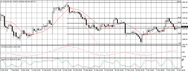 ارتد الذهب نحو الاتجاه الصاعد بعد ان فشل فى اختراق مستوى الدعم عند خط الفيبو 38 ليعيد اختبار خط الفيبو 50 عند السعر 1327.00$ للاوقية كما هو موضح بالرسم.