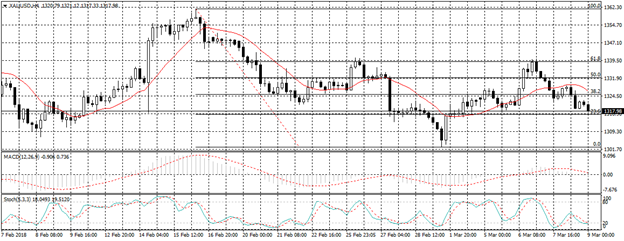 ويتداول الذهب الآن أسفل خط مؤشر متوسط الحركة , ويظهر كل من مؤشر استوكاستك ومؤشر ماكد تقاطع سلبي نحو الاتجاه الهابط على الاطار الزمنى اربع ساعات