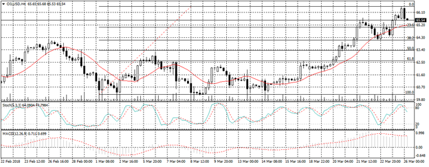 ويتداول النفط الآن عند خط مؤشر متوسط الحركة ,  ويظهر كل من مؤشر استوكاستك ومؤشر ماكد تقاطع سلبي نحو الاتجاه الهابط على الاطار الزمنى اربع ساعات