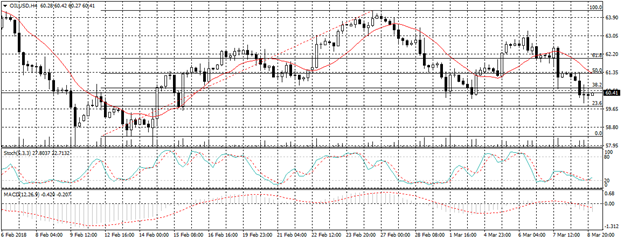 ويتداول النفط الآن أسفل خط مؤشر متوسط الحركة , ويظهر كل من مؤشر استوكاستك ومؤشر ماكد تقاطع سلبي نحو الاتجاه الهابط على الاطار الزمنى اربع ساعات